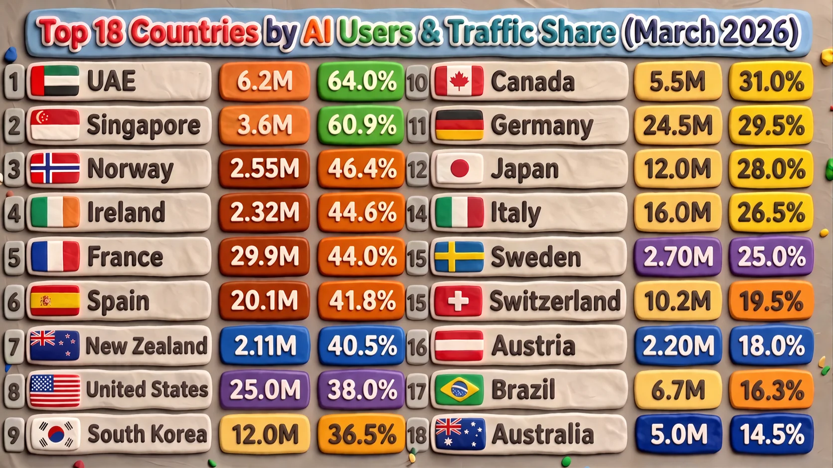 2026년 3월 기준 최신 데이터에 따르면 ‘인구 대비 AI를 가장 활발하게 사용하는 국가 Top3’는 다음과 같이 나타났습니다.